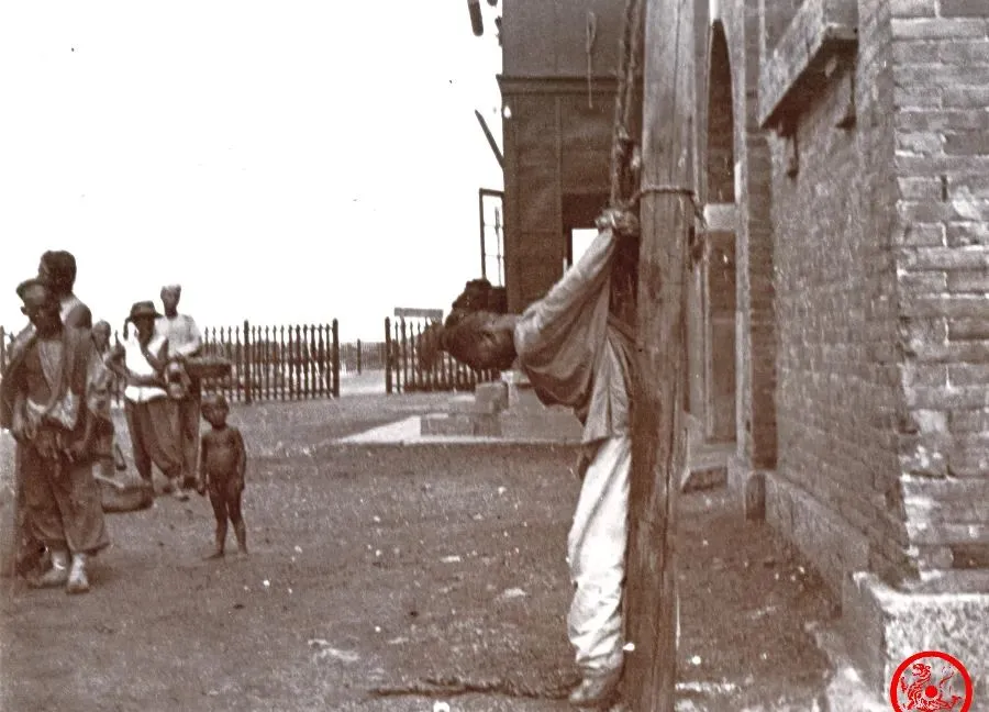 图里这本地人被绑在柱子上,身子悬挂着,绳索扎得死紧,旁边围着一圈看热闹的乡邻,有的小孩站着光着脚,有人挎着菜篮,表情不尽相同,这一幕在今日城市里根本想不到,旧时公堂前常有”示众”的场景,家门口远远见着就吓得不敢过去,大人还会小声叮嘱不要惹是非,过去治家治村可没什么讲情分,手段硬,见过一回终生难忘。