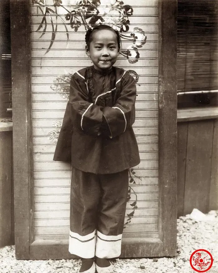 这张照片上的小姑娘一身黑色对襟长衫,袖口裤脚带着白色缎边,两只小辫子盘得圆圆,手背在身后,眼睛里满是亮光,靠在画着花草的木门板前,说不定是刚写完字,或者午饭刚吃完就出来透气,小时候农村家里也有这么一块地方,孩子站着,墙后传来锅碗瓢盆声,那会儿小孩儿欢喜给人拍照,都是稀罕的事儿,放现在随手一拍那时可没这条件。