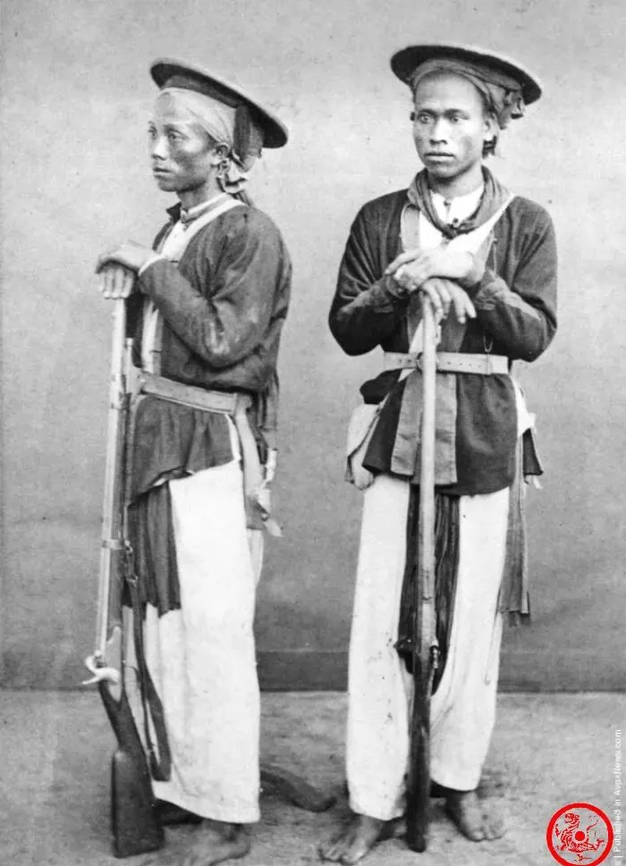这照片里的二位兄弟,戴着旱烟帽子,宽宽的布衣腰间别着刀,肩膀上扛着步枪,脚下没穿鞋,目光带着精干,也许刚打完一仗,也许等着换岗,那会儿乡下新兵还真是挑得紧,爷爷就讲当年自己村的兄弟被抓去当兵,跟着走个百十里地再没回头,老照片里的兵器虽然老旧,站姿却一丝不苟,都是把命系在裤腰带上的人儿。
