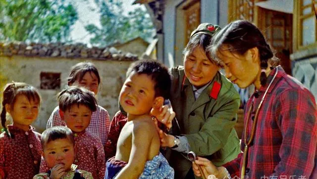 浅色衣服的小孩板着脸靠在大腿根,身边的女卫生员一手拎药瓶一手扎针,几双小眼睛盯着不眨,围观的大多是姐弟兄妹,妈妈在一边抬手轻轻拍,“别怕,就一点疼,忍一会就好”,以前没有诊所,二队打针就和看集一样,队长还得拍板排个顺序。