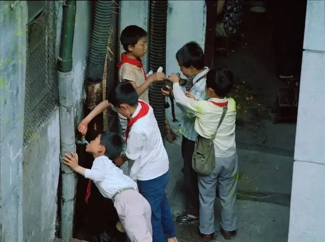 放学后围着水龙头抢着喝水,每个人都仰脖急咕噜,一把领巾挂着,水珠顺嘴角滑下来,老师在远处吆喝“快点回家”,没人理,嘴里甜,汗味也淡了。