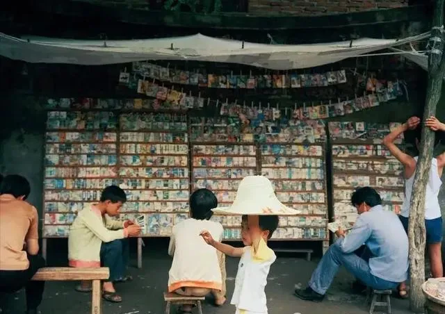 墙上挂满小人书,绳子一排排拉起来,地上小板凳,大人孩子全都蹲在前头看,两分钱一本,有人掏口袋可以连看半天,顶着纸糊灯罩的小孩最抢镜,谁管外头咋地,书摊这块就是小小的快乐区。