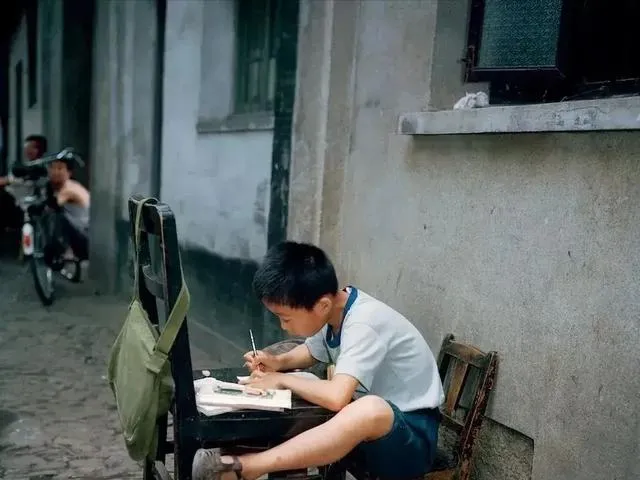 小板凳搬出来,靠墙一挨,胳膊撑着画本专心写,旁边铁盒拎包挂着,弟弟有时从身后骑车路过,还忍不住回头让下路,这就是那年头的安静专注。