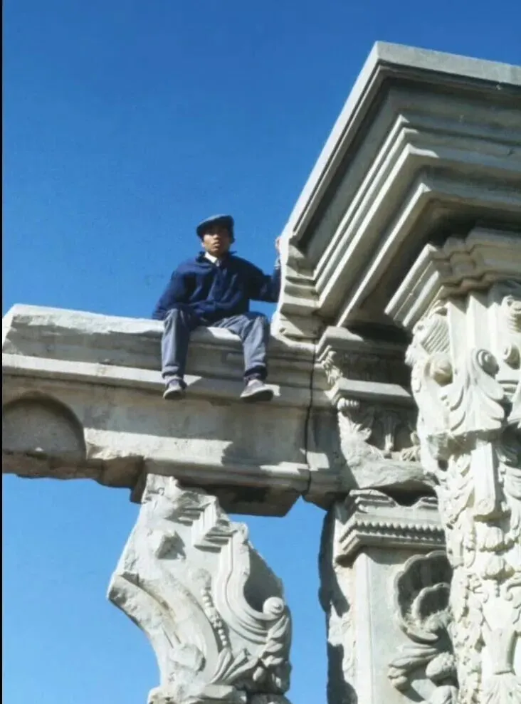 这个蓝衣服的人一屁股坐在断石头上,帽檐往下压着,脚底下就是那标志性的雕石边角,那时候这景点没现在这么多规矩,游人能近到零距离都见怪不怪,我爸那会儿咂咂嘴说,唉,小时候能爬现在罚款都够吃顿饭了,这一条,现在的小孩都不敢学,再看那蓝天底下,这石头晒得发亮,历史和自由就真搅一块儿了。