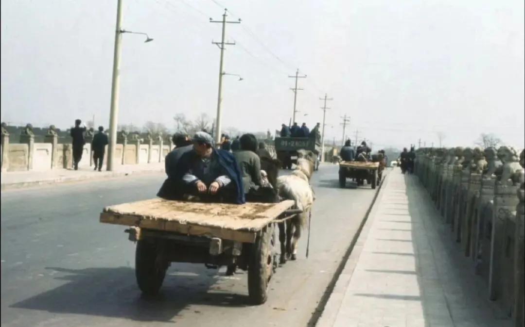 这张老照片要搁现在真看不惯,卢沟桥上车马混行,大货车、马车、还有推车的,路边栏杆整齐站满石狮子,那会儿卢沟桥是条宽马路,桥面看着像铺了柏油的似的,桥两头人来人往都带风,妈妈拎着菜篮子嘴里念叨,现在不让车走早就对了,那年月谁管行人车辆混着,人和桥都结实。