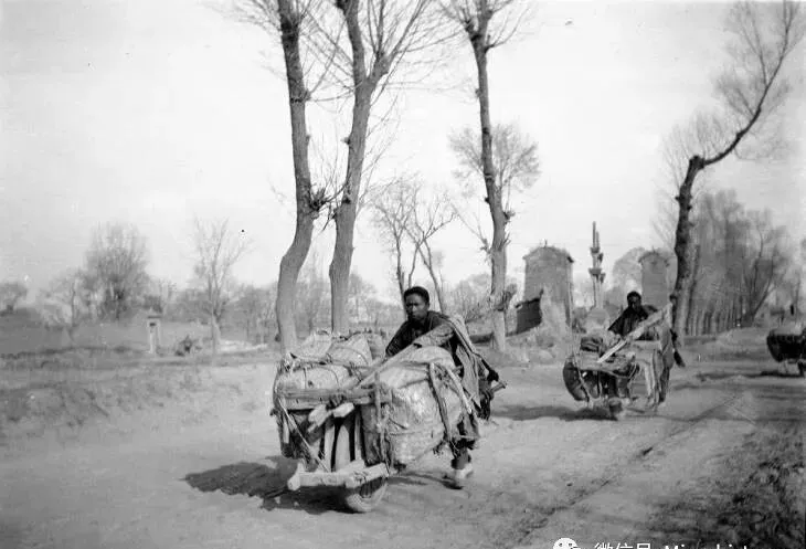 这队人推的就是陕北常见的独轮车,轮子大架子窄,前头驮着一堆家什,靠膀子劲推着,颠簸的土路越走越远,肩膀手腕都要磨起茧子,一下雪那车就在泥洼里打滑,小时候见过村口老王推着独轮车回家,筐里堆满柴火和粮食,他总说得精打细算一趟带完活,逢集市就是一条小队排在道上,比现在开小电驴还拉风。