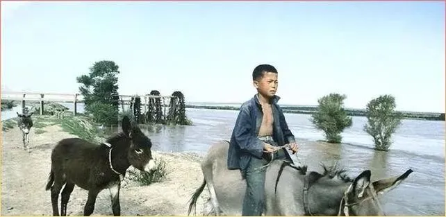瞧这张照片,一个小男孩骑着灰驴,身边还跟着黑驴,身后是被洪水淹没的田地。那个年代的孩子,小小年纪就得帮家里干活,赶着牲口去放牧是再平常不过的事儿。记得咱们小时候,一到暑假就得下地帮忙,哪像现在的孩子,放假就是补习班,夏令营。看着这孩子穿着破旧的蓝褂子,光着脚丫子,在洪水边上还得照看牲口,这份懂事和坚韧,真是让人心疼又敬佩。