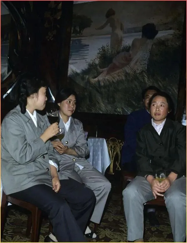 三位穿着灰色,黑色中山装的女同志,坐在油画前认真交谈。这样的场景在70年代的文化馆,工人俱乐部里特别常见。那会儿的人们,业余生活就是学习,开会,看展览,没有手机,没有网络,但人与人之间的交流却格外真诚。看她们手里端着茶杯,神情专注,聊的可能是工作心得,也可能是生活感悟。那个年代的慢时光,现在想来,竟成了最奢侈的回忆。