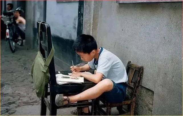 最后这张照片,一个小男孩坐在街边的小板凳上,趴在更小的凳子上写作业。身后是斑驳的墙壁,旁边随意搭着的衣物,这就是那个年代最真实的生活场景。没有书房,没有书桌,甚至连个像样的台灯都没有,但孩子们照样把字写得工工整整,把书读得明明白白。苦日子里长出来的孩子,骨子里都有股不服输的韧劲儿。