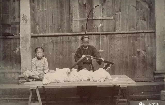 这个画面里边,母子俩守着一堆棉花,手里的家伙叫弹弓,不是打麻雀的,是弹棉被的弹弓,弓身很大,绳子绑紧,弓头一下下敲着桌子,把死沉的棉花全给弹松,云朵一样攒起来,棉絮蓬松了,做的被子轻软又暖,坐桌边的小孩板着脸,其实多半惦记着弹完能不能剩块糖吃,有时弹一下午,满屋子飞絮裹着太阳光,邻居家晾在门口的老被单上全都落满了白点,弹棉花的手艺人走街串巷,脚步声、弓绳崩的声响一年四季都不绝。