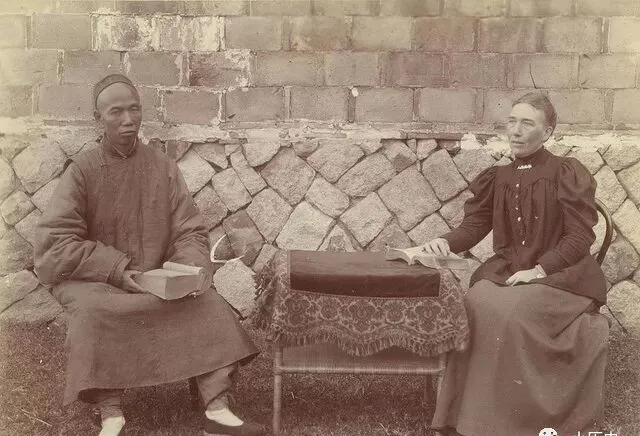 照片上一张西式桌布搭着桌角,一边坐着老外太太,另一边是当地的先生,这俩人其实是师生,太太正学汉语,课本压在手上,阳光洒在石头墙上,两人姿态都端正,窗外是清末难得的安静,家里老人总说过去村里要是碰见洋人,娃娃头一次见都躲在娘后头,只敢悄悄瞄一眼,人家却安安静静翻着书,岁月有时就这样碰一下,谁也拦不住。