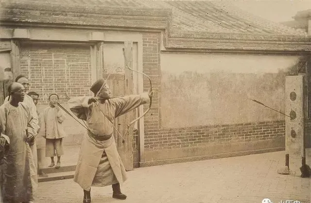 清军士兵张弓拉箭,对着两步远的靶,这姿势看着像练把式,可箭头扎得离靶子不远,旁边围一圈人,手里都藏着笑意,爸说那时候部队里操练也是热闹事,尤其孩子看见真家伙,等解散了都试着摆同款架势玩闹一阵,彼时军威不咋样,可活气还在年轻人身上生生不息。