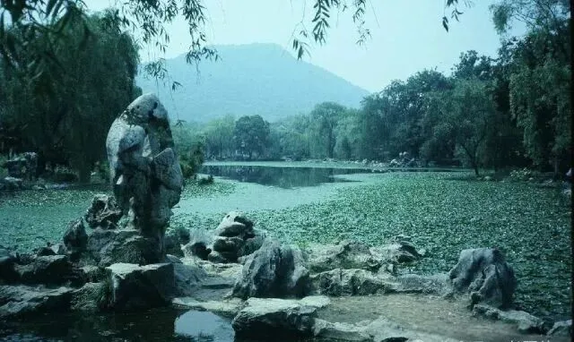 图上的这堆怪石,就叫“太湖石”,西湖边几处都有,歪斜着立着,旁边一圈荷叶搭着水气,夏天走累了就爱在这歇着,水汽加着山风,脑袋一下清爽不少,小时候陪爸妈出来兜圈,一路数着脚下凹槽,谁一脚踩空,就被哥哥笑话不停,有时候见到石头上有两行细缝,说是整个石头都得人工修过,现在公园翻修了不少,早年这种自然原味的石景倒越来越稀罕。