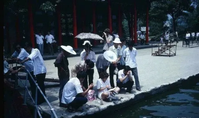 画面里的亭子叫“荷亭”,纯木头搭出来的檐角翘着,下面有人靠着柱子打盹,背后全是一池荷叶,绿得像泼出来的墨,没有鱼跃也没有喧闹,只有枝叶流动的阴影,那时候的景区没什么围栏警示,想往哪坐就往哪坐,老人们靠着亭角聊家常,小孩子捏着荷叶杆一根一根地折,赶上下雨天,亭子下更是坐满了人,个个都只盼天赶紧放晴。