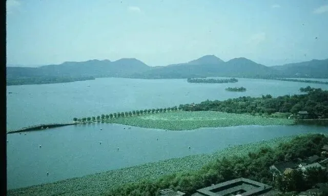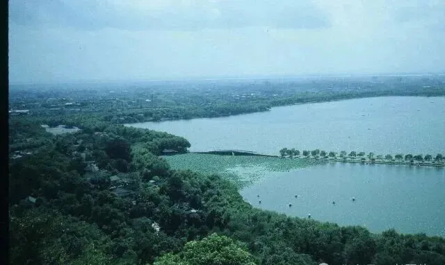 这张俯瞰的画面,把西湖的形状全揉进了一口气里,林子密密麻麻展开,湖水连成一片,苏堤像根绿绳子一样横在湖中,爸说以前上断桥,能一路骑车过去,人稀地广,湖上时不时飘着一只划船的点影,没有现在游船喇叭、游客队伍那么闹腾,偶尔遇见老头抽着旱烟,眼神里全是松弛,那会儿出门不讲什么自拍,只图个自在。