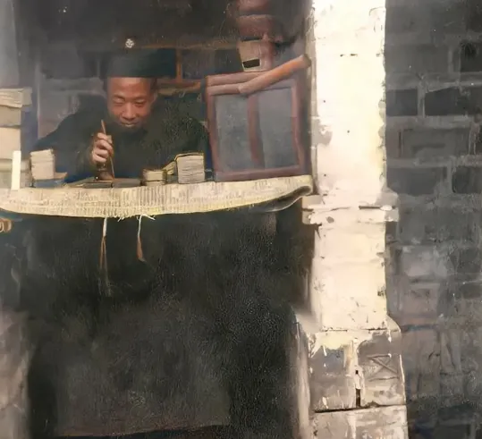 别看这位爷坐在小格子窗口里,其实是账房先生,旁边挤着一摞厚账本,算盘搁在案边,左手压着账不让页翻乱,右手笔不停歇地写,小门小窗里习惯昏黄灯火,盘里算盘珠子光可见人影,爷爷小时候在村口供销社也看过老账房数账,当年干这个活儿最要眼明手快,算盘噼里啪啦响,错一笔那是要挨老板训的,账房先生一抬头,脸上油汗熬出来,时间长了手上也能摸出算盘棱角的茧子,一本账管一村人家吃穿,活像定心丸,现在谁还记得那些正楷小字,早都让电脑替了。