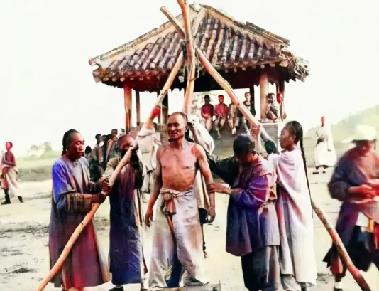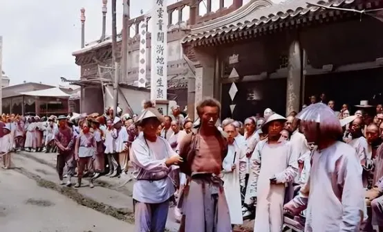 这个画面谁都说不上能下饭,刑场上的凌迟犯人,上身扒光,双手被人拽着,两边杖子横过来,四周一圈围观的老百姓男男女女站着看热闹,刑场棚子下坐着几个人,有人在聊天,有人眯着眼瞄,不见有人遮掩,办法没有,落到这一步,人命都不当回事儿了,听老辈人讲,那年头看个刑罚,仿佛就是赶集,每逢有重犯处理,街路两边挤满人,哪像现在看见这种场面还要封锁,还要避讳,照片影子扒下来的不止一个人命,那被围观的劲头比庙会还大,可一百年前看作寻常,现在成了眼不敢看的禁忌。