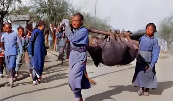 最后这个,图里俩苦力肩膀上扛着一头大黑猪,粗木杆一抬,服装宽松裤腿塞进袜口,脸上眉头挤着汗,五官一紧一松全写着累,街边有人驻足,有人自个儿走路不理会,干这活儿的人腰板都是练出来的,叔叔小学时赶过猪腿,抬一只都能走泥路好几里地,早年间机器进不来,什么活都是手里扛肩上抗,现在光点个外卖就能吃肉,那时候得自己跑腿,花力气才换来一顿肉香,手上全是老茧,肩上扛一条路,光看照片,就能闻出力气活儿里的汗味。