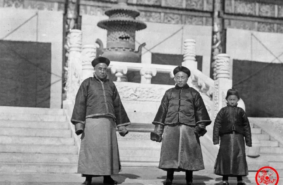 这第一张老照片,一字排开六个爷们儿,拍得特别有意思。图中这帮人叫合影里头最有生活气的主,一水短发长袍,帽子朝前压得死死的,站在宫殿石阶上,三个人中间胖瘦不一,边上这位嘴角微微一咧,表情里自带点滑稽劲儿,整个人松松垮垮,像是刚吃饱嗓子里还含着一口笑,旁边一位神情正经点,额头略发亮,手都伸在袖里头没露出来,小孩打扮的站得最老实,拎着一双小手,眼神怯怯地瞟镜头。