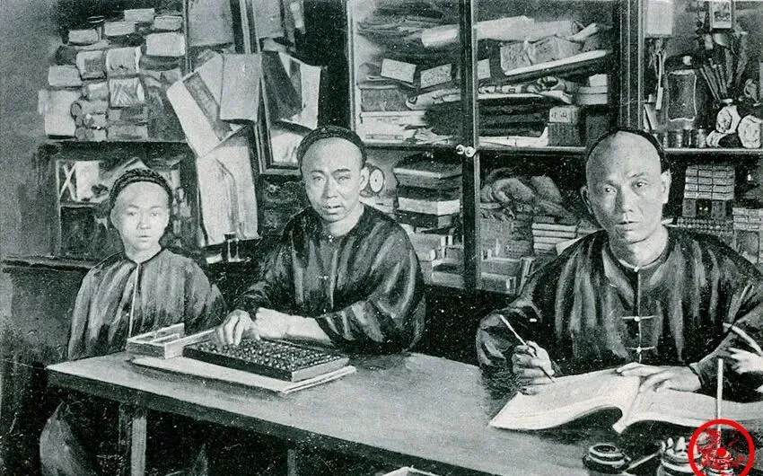这张是店铺里的三位伙计,人人头上留着长辫子,身上罩着直身的黑布褂子,玻璃柜后头堆满了信纸账册、纸包票据,也没见啥名堂的柜子,都是随手码着,左边那位少年手指边敲边算,算盘珠子咯噔响,右边一人皱着眉头抄抄写写,纸张都压实了,操作熟练的样子像极了旧时账房先生。我爸说以前算盘敲得啪啪响,单靠耳朵就能知道算盘珠排到哪一步了。现在全电脑对账,算盘珠子早没声音了。