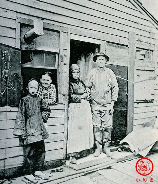 这一张是老商铺门口,左边是小伙子,头发平分,穿着斜扣长衫,神情里有点拘谨,中间西装女人倚着中国人,边上的老外男人戴毡帽双手交握,四个人站在门口,背后是一排木板房,斑驳墙皮随风响,那年头,中西合伙开店的可不多见,图上人人的神态都有些埋着话。以前合作大多靠口碑,华人与老外能相守一块混口饭吃,说起来全靠那股肯扛能熬的死心劲。现在谁还会在破木屋门口合影,照片一拿全是回忆。