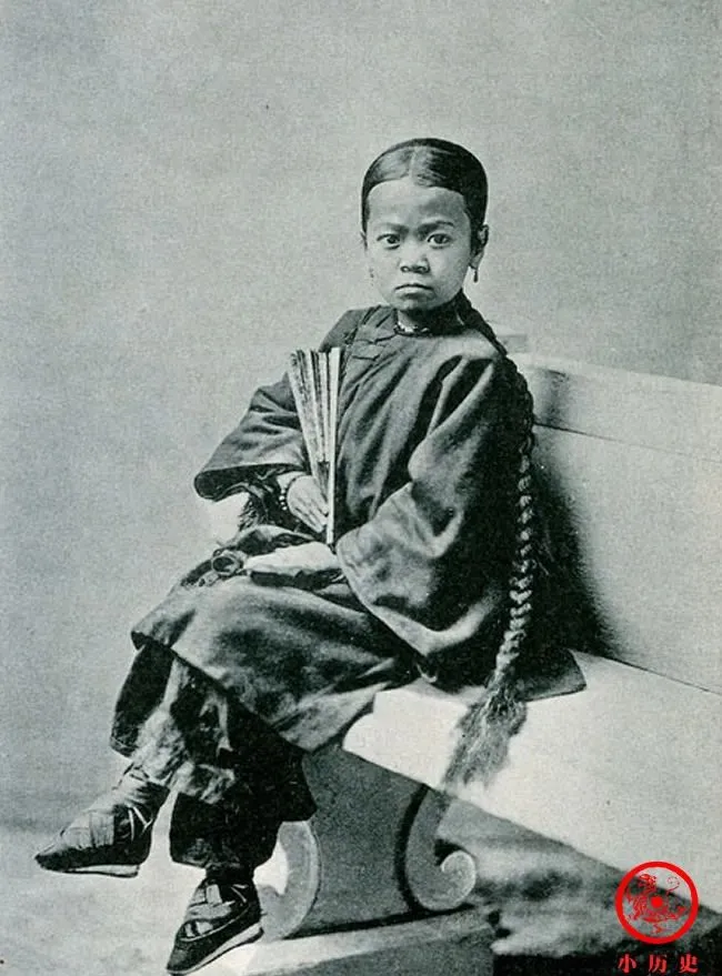 这个女娃一坐那板凳,一股认真劲写在脸上,头发打得出溜滑,一条小辫子一直垂到膝盖下面,脚下穿一双三寸金莲,腿紧紧夹着折出来的弯,小时候听姥姥讲谁家闺女裹了脚,走路一拐一瘸,鞋底磨出一道道亮痕,传说那叫美,可真到眼前就觉酸,老照片就这么铁证在眼皮底下,现在娃娃走路都要撒丫子,这样的鞋子见都没见过。