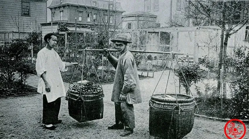 这一张挑扁担的卖菜人,肩上一根横木,两头是深口大篮,里面全是新鲜菜叶,看着沉甸甸的,路边老兄笑出一口白牙,另一位递手点数,动作老成见惯不惊。那时候漂洋过海的华人,什么活都能干,扛得住才吃得上饭。现在买菜谁还见过这么挑着出来卖的,超市无非刷个码,生活是省劲了,但人情味淡了不少。