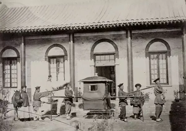 这张照片里的那顶大红花轿,老北京人一看都明白,讲究的“八抬大轿”,漆红轿身上绣着金丝祥云,两边挂着红穗儿,门口笼着纱幔,气派十足,新娘得从这儿上轿出门,四个轿夫抬得挺直,后头还跟着一溜管家、丫鬟、婆子,嘴里小声嘀嘀咕咕,老妈子絮叨:“别绊脚,小心点”,那年头能坐花轿出门的,家底和门第一眼就甄得分明。