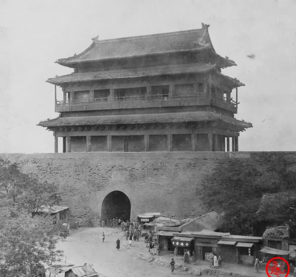 图中这座高高的楼,就是西直门城楼,灰砖搭的厚达一米多,屋顶是双层的大挑角,站在下头仰头一瞅,墙上岁月留的疤痕跟刀削的一样,小时候只在老人嘴里听说,靠近北城,进出商队驮着货,一溜骆驼和大车就从这门下过,门洞两边的小铺子,卖包子、缝鞋的、打铁匠,横七竖八挤着,早上赶集的人把路堵得严严实实,城门口这股热闹劲,现在只剩照片里的影子了。