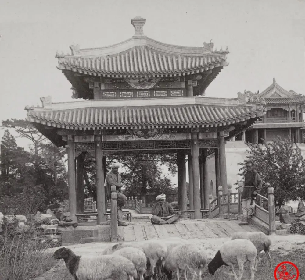 图里那堆羊不是摆拍,是真有农民赶着羊在颐和园边上吃草,前面是苏式门楼,几个人靠着栏杆晒太阳,有带毡帽的、也有光着头的,羊群挤在一块,那里头时不时就冒出几声咩咩,老北京人讲,清朝时候颐和园那是贵人歇夏的地方,寻常老百姓连前脚都不敢踏,眼下这阵子,八国联军闹完,太后和皇帝都让赶出去了,园子变地气了,农民把羊赶进去,这要放在清朝,真是连想都不敢想。