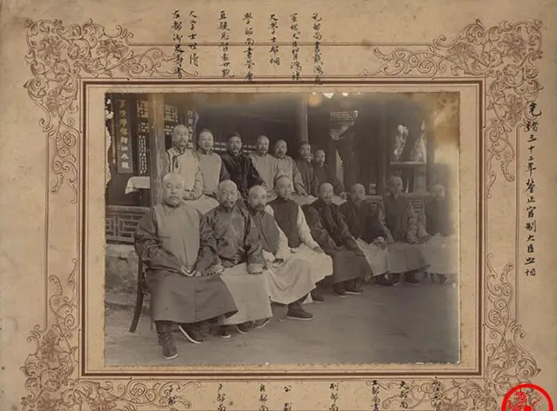 图中这张合影,外头描着花纹框,里头十五位大臣排坐一堂,长衫褂子利落干净,神情端着,气场全摆在那,外头光线不算亮,人物倒都清清楚楚,比起后来花花绿绿的彩照,这种偏黄调子的老照片,更像把一段历史按死在纸上,屋里悬挂的老匾,墙角边的檐廊,全是典型的清末官衙模样,一看就带劲,有的长胡须一把,有的脑门锃亮,一排坐着全是北京腔的架势。
