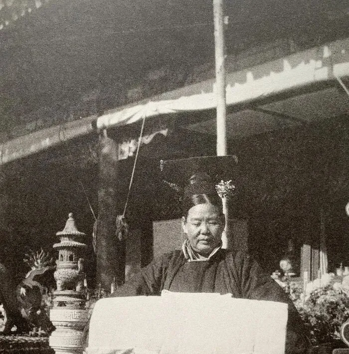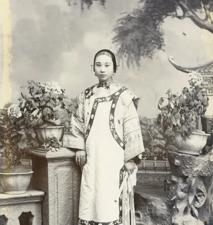 影视剧总爱把宫女拍得个个鲜亮、水灵,真看老照片才知道,她们首先是人,其次才是角色。脸上没有夸张妆面,神情也谈不上灵动,更多是被规矩包着的安静。身后的盆景、石座、布景,都是照相馆里常见的摆设,可人站进去,还是透着一种旧时代女子不大敢松弛下来的劲儿。