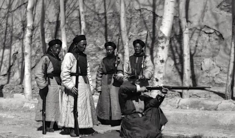 站着的人把枪立在身边,蹲着的人举枪瞄准,这动作一摆出来,画面里就有了冷硬气。可你细看他们穿的厚袍、坎肩,又会觉得这不是现代军队那种利索装备,而更像旧制度里的人,硬把新家伙背在身上。旧衣裳配洋枪械,本身就是晚清那股别扭劲儿:日子已经被时代推着走了,身上的活法却还没来得及换。