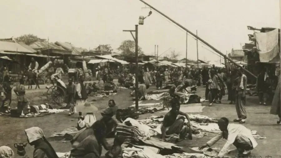 这是一张很热闹的街市照。地上铺开的布,摆着的旧衣物或杂货,看着像集市上的地摊。很多地方从前做买卖,不是店面先行,而是先有一块布、一副担子、一辆车,人往路边一蹲,生意就开张了。