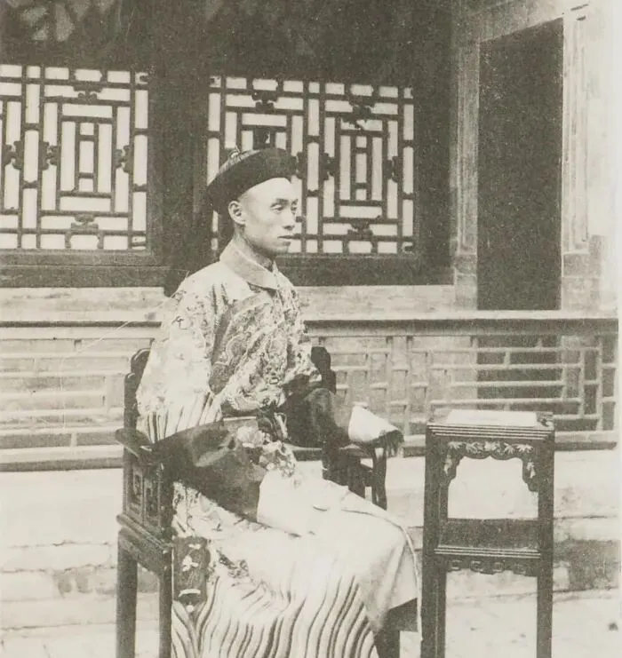 这张像是一位晚清官员或有身份的人坐在院中留影。木椅、小几、窗棂,都是典型旧式陈设。那把椅子不是今天随便一瘫的沙发椅,它讲究端坐,讲究手放哪里、腿收多齐。小几也不只是摆设,往往放茶盏、文房物件,待客时更是少不了。