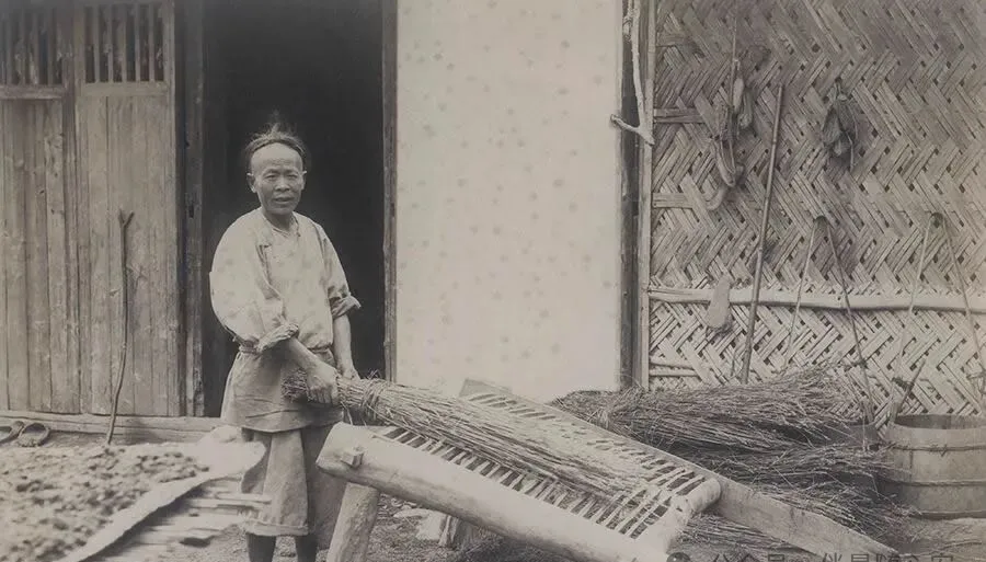 这一张特别好,门边靠着竹器,老人手里也拿着像竹枝扎成的扫帚或刷具,旁边那件大竹编器物,看着像筛床、晾架,很多地方叫法可能不一样,但一看就知道是做家务、做农活离不了的东西。