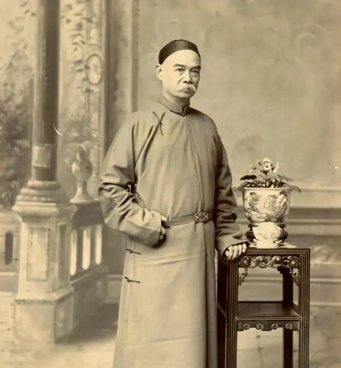 长衫、腰带、花几、瓷盆,合在一起,就是那个时代体面男子的出场方式。你会发现,老照片里很多人都爱借这些物件入镜,因为它们像今天的背景墙、沙发、装饰柜,都是一种“我是怎么过日子”的说明。只是那时候的体面,更安静,也更含蓄。