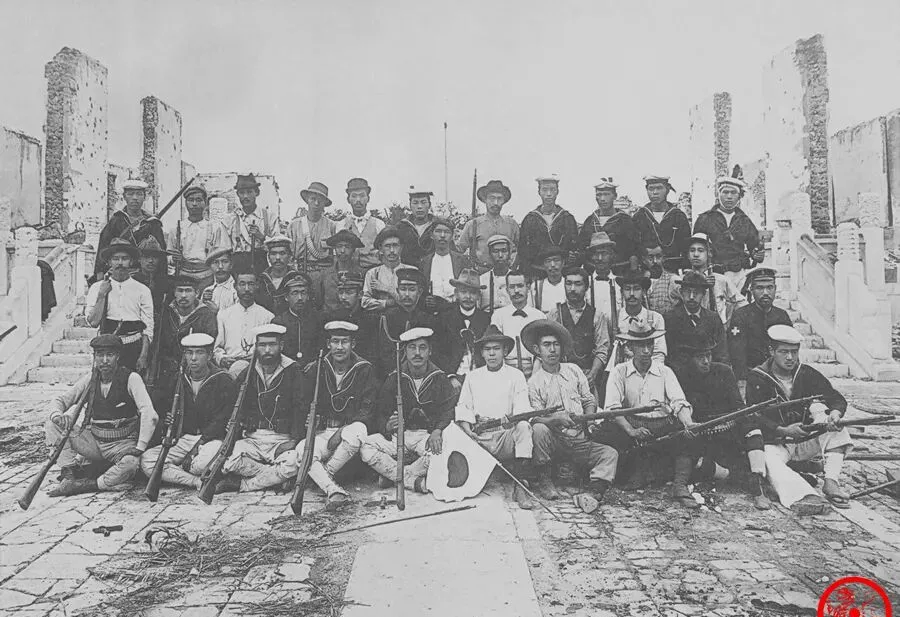 这一群人正是王府里留下的兵丁,端枪的、拎旗的,眼神大多冷静麻木,合影里人多,连县官样的也混在里面,地上碎砖乱石,王府台阶都踩得起了茬,没人管他们衣服上沾多少灰尘,只有那膏药旗最抢眼,时代一推翻,就是外人做主,府里下人早跑光了,这堆兵在废墟里也没什么老惯例可循,照片里谁是谁已经说不清楚,院子里只剩下这些泥脚印和兵声兵气。