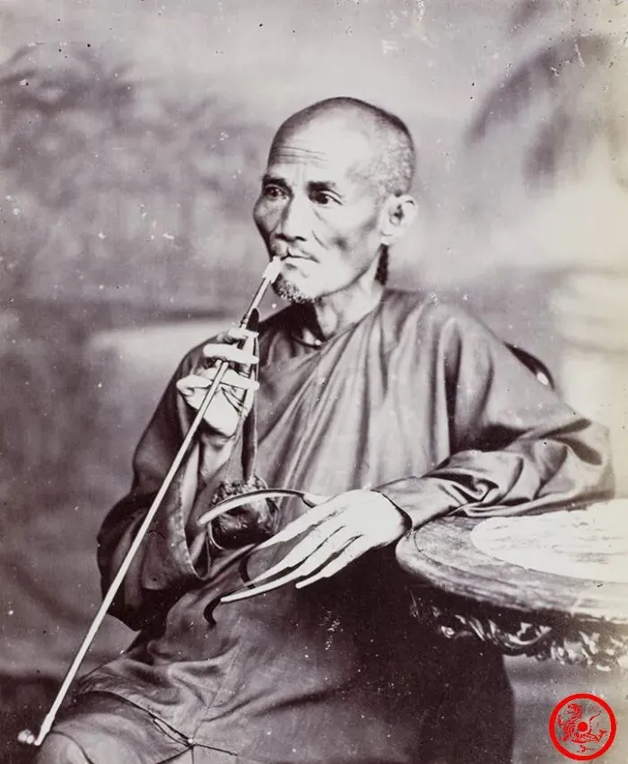看图里这位年纪大的先生,头发稀疏,胡子苍白,手边杵着烟嘴,一副悠闲自得的样子,这手上指甲跟镰刀似的弯过来,那可都是年头堆出来的,十指留得溜光,里头藏满了讲究和排场。
