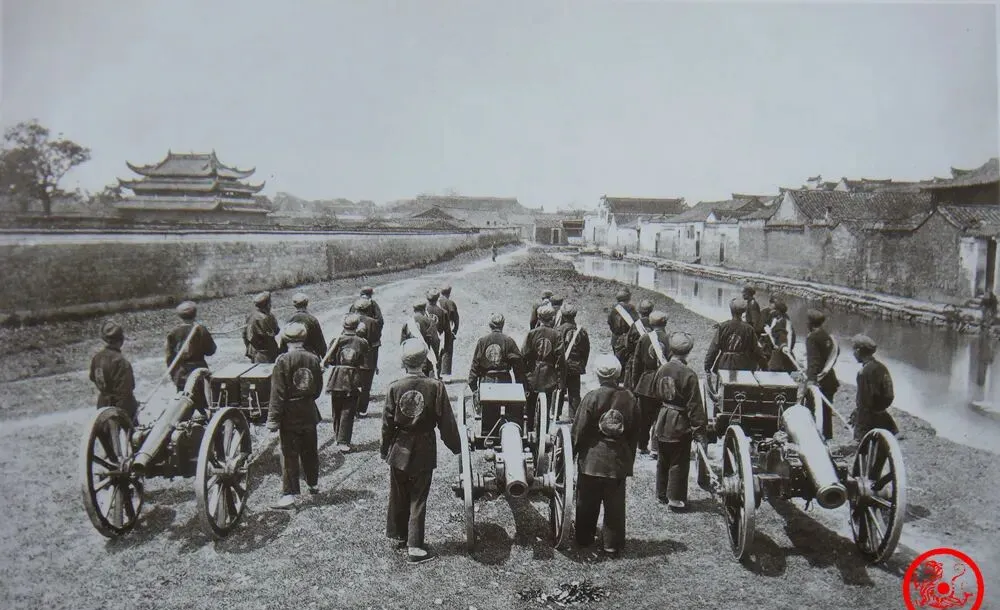 这张又是另一个角度拍的炮队场面,站定的人群和远处的老城墙基本没变,单是光影一转,大炮和水边的倒影都能看出年代感,老房子、城门和兵勇身上的徽记,给人一种时间让人忘了色彩,却留住了分量,爷爷说那会儿“大炮扎在城根下,比牌坊都唬人”,现在只能照片上碰碰运气。
