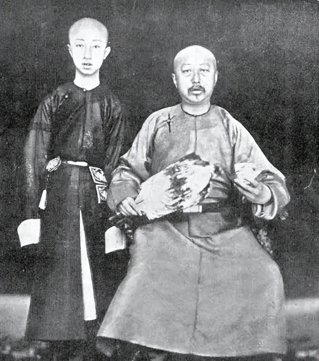 这时候孩子已经长高了,瘦,站得笔直,脸也拉开了,少年气出来了。很多人说这张是光绪和生父奕譞的合影,也有人对人物身份有过讨论,但不管怎么说,照片本身非常耐看。它最抓人的地方,在于两个人虽然同框,却已经明显不是第一张那种“幼子依父”的感觉了。