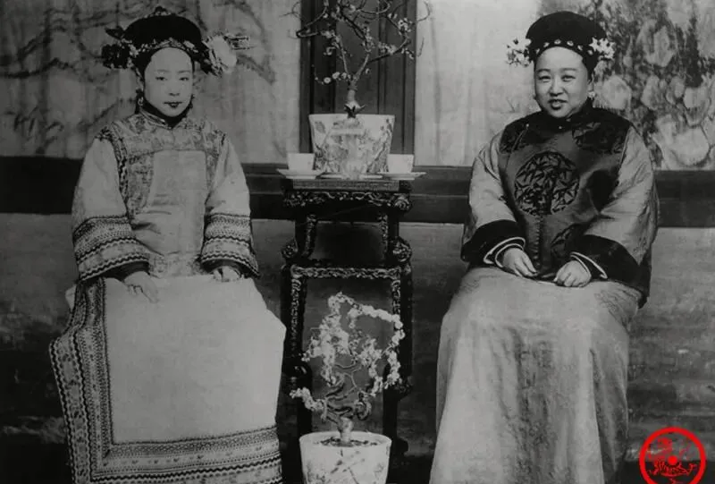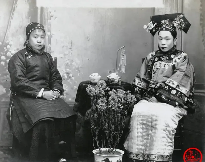 图中这两个身穿绣花长袍、头戴旗头花饰的旗人妇女,规规矩矩坐在椅子上,边上还点缀着梅花盆景和老式家什,搁现在拍照大家都讲究“C位”,可她们就那么端端正正地坐着,没一点刻意,身上大襟滚边、云肩绲线的细节,衣袖密实厚重,跟咱们小时候看戏时的花旦装有点神似,但这个气派,不是舞台上装出来,是骨子里养的,小时候家里老人就说,清朝贵人最讲究的不是首饰多,是这身衣料和坐得住的气质,现在想想还真是那么回事。