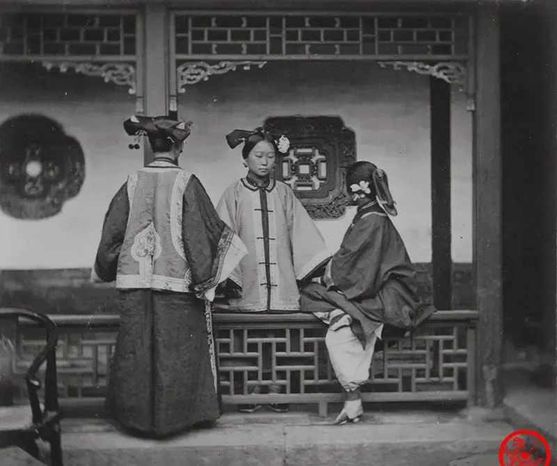 图里左右两个一看就能分出来,右边的旗人妇女梳着高高的旗头、锦袍金线一身光彩,左边汉人姑娘则朴素许多,面色收敛,袖子齐整,小时候家里老人看照片总是嘿嘿乐,说“你瞧旗人那个坐姿,没练过还真坐不住”,两种气场,光图里一放就能给人一面墙的差别,难怪那时候旗人家里女孩有底气,总是敢冲着男人扬扬下巴。
