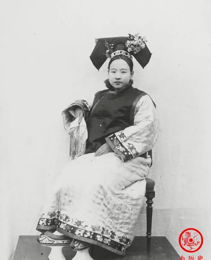 这个穿着锦缎长袍、头戴宽大旗头钿子的旗人妇女,坐姿稳当地不动分毫,长袍拖地边沿绣着团花,袖口也是一圈圈繁复花卉,有点像之前看见过的“娘娘钿”,下脚踩着花盆底,鞋头往上翘,贴花堆锦显得分外高挑,家里老一辈以前常取笑,说旗人妇女“脚不碰土、走路仿仙”,仔细一琢磨也真是,高底鞋子抬身子,气场自带,哪怕坐着也透着股威风。