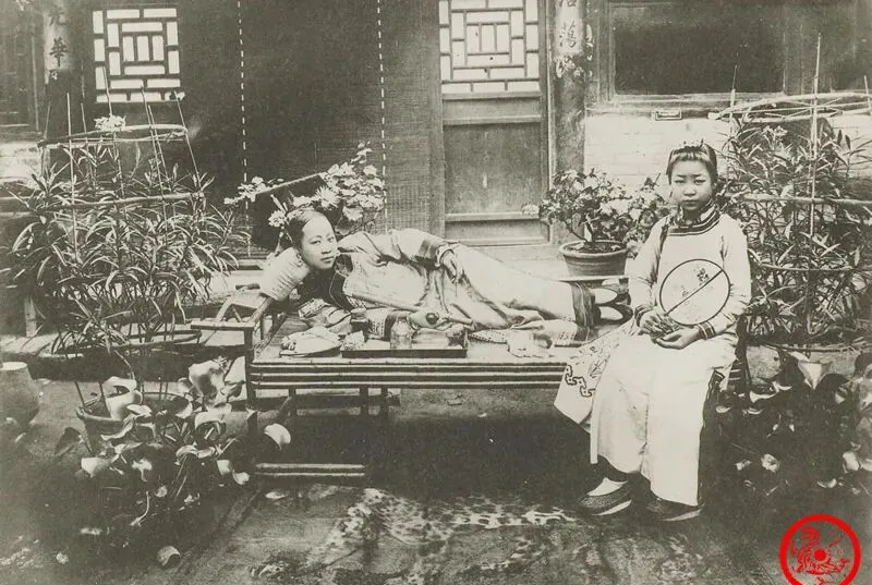 照片左边那位斜躺在竹榻上的旗人贵妇,手里拿着烟杆,悠哉游哉地抽着大烟,神态里透着一点不服管束的潇洒,家里的长辈遇见类似话题,总是笑着摇头,说那时候有钱有身份的旗人贵妇没少沾这口,逢年过节茶余饭后,各家妇女拿烟杆凑一块,一边抽一边聊家常,谁说那会的女人就没脾气,没了这份悠闲劲儿,日子还就过不出花样来。