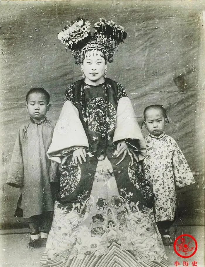 这个盛装的旗人贵妇,脑袋顶着硕大的头饰,钿子一圈式样,珠翠垂下来几乎半遮着额头,身上大花袍、团寿字,下面还是一溜华丽的包边,小时候看老照片没懂这些装饰,家里奶奶都说,钿子可不是想戴就戴得上的,只有逢年过节或者进宫选秀才有资格,哪像现在想怎么打扮就怎么打扮,那会儿可都是规距。
