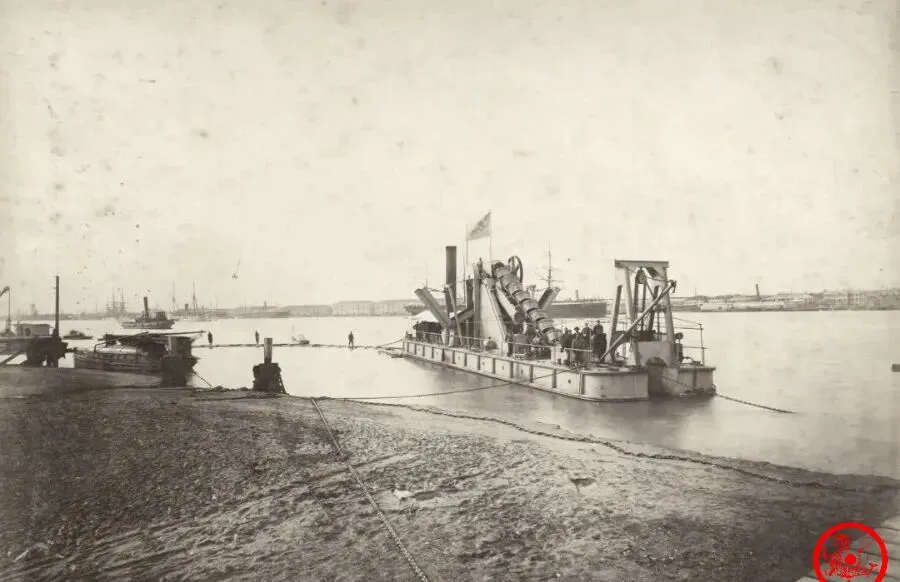 这艘庞然大物叫挖沙船,横在黄浦江上一动不动,船头硬邦邦地朝着江心,身后挂着一大串链子和滑轮,小时候跑江边,看着这样的怪船总觉得里面都藏着机关,这种家伙平时是难得一见的,能在晚清被拍下来更不容易,照片上江对岸还有一圈模模糊糊的洋楼,老一辈常说,外滩的气派和热闹都是从这些忙活出来的。