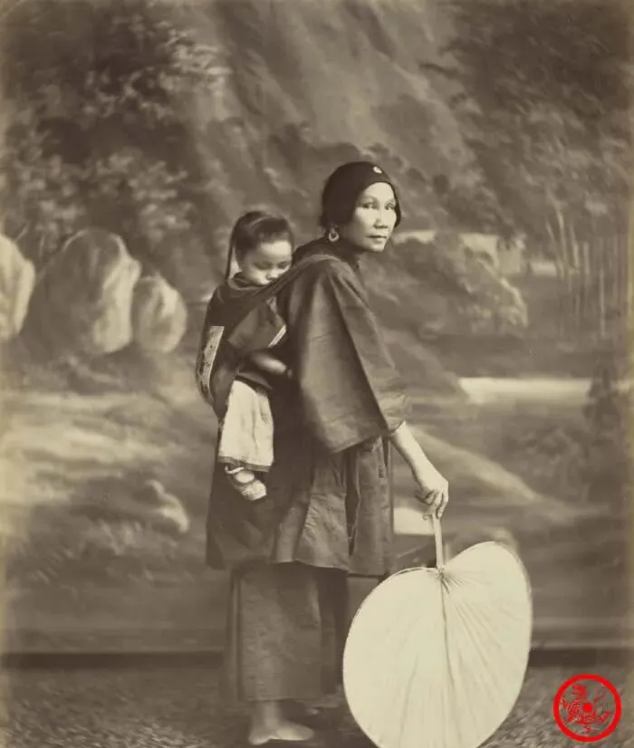 这把扇子大得惊人,一手撑半边天,妇女背着孩子站定,扇面白花花一片,竹柄压在掌心,妈妈小时候总说,老太太夏天甩芭蕉扇,就是那个镇场子的姿态,天再热她都不慌,小孩在背上睡得死沉,脚下鞋子还踩着后跟,“潮流”二字有时候就是个姿势,没裹小脚就能挺直腰走路,家里人都说有劲头。