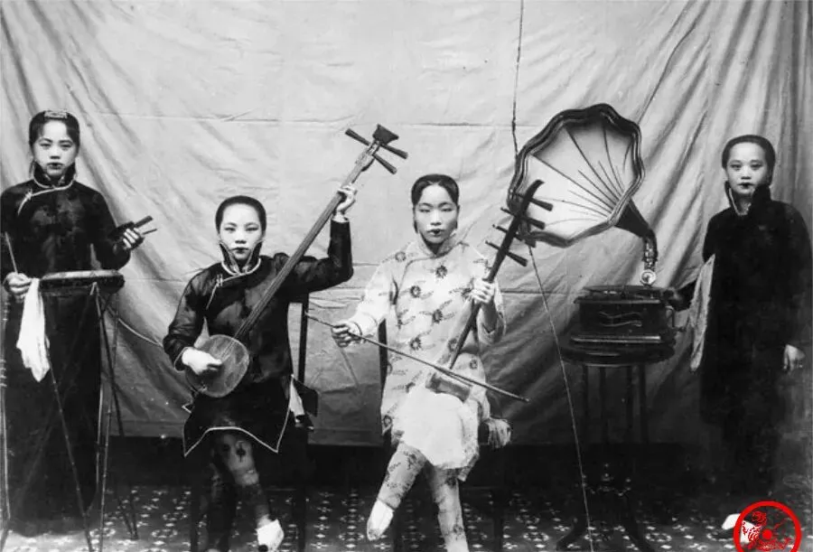 一溜女演员,各自抱着二胡、三弦、鼓板,不见什么舞台,只有壁布和一台大大的留声机,这机器其实是身份的象征,有钱人家玩得起,旁边的小姑娘眼神很直,估摸着见惯风浪了,家里小辈儿提起来,“以前听唱曲子,就这点娱乐”,如今早没人看见她们那身衣裳变成什么样了。