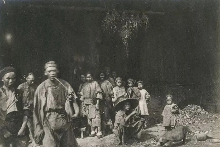 图中这一大家子站在院门口,最前面的老头叼着烟筒,后头一溜小孩排成队,染得乌黑的袄子上落层浮土,屋檐下吊着干辣椒和别的农活物件,院里地上是乱糟糟的稻草和柴,左边几个人衣服袖口油光出神,站得笔直,脸上一点笑容没有,这种画面在当年不稀罕,就是一家人干完活往门口一站,却被老外当了个宝,搁现在哪家愿意这样来一张,估计早被笑话死了。